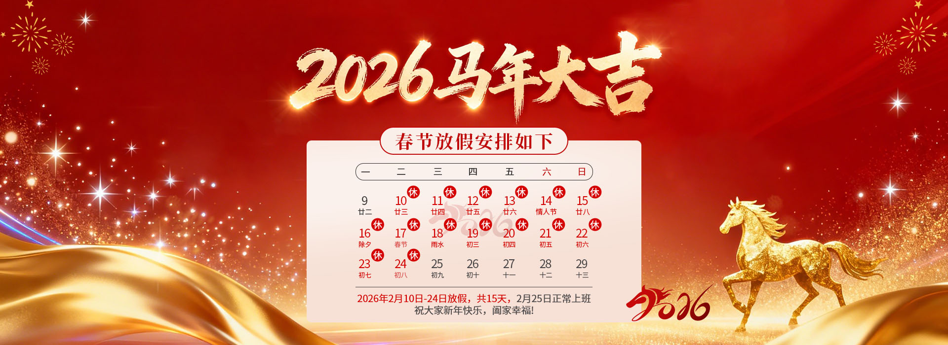 2026 年春节即将来临,为让大家度过一个祥和愉快的春节,根据国家春节放假安排并结合公司实际情况,经管理层研究决定春节放假时间安排如下: